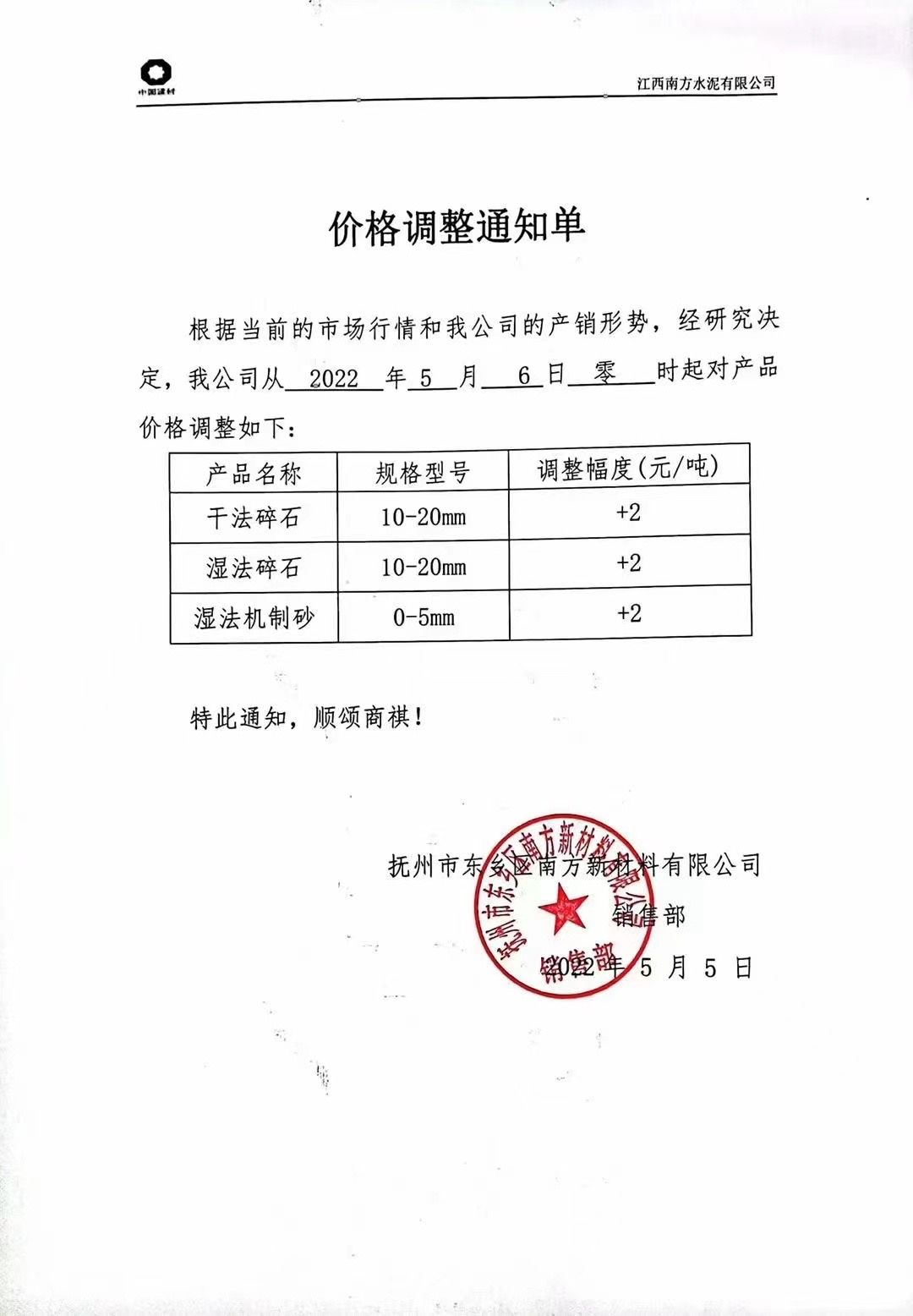 據市場調研顯示:五一節后,江西撫州(撫州砂石)東鄉區南方新材料有限公司通知,上調砂石價格2元/噸,是今年以來的第一輪價格上漲。撫州東鄉區南方新材料公司為江西南方水泥集團子公司,在撫州以及南昌等地頗具代表性。
