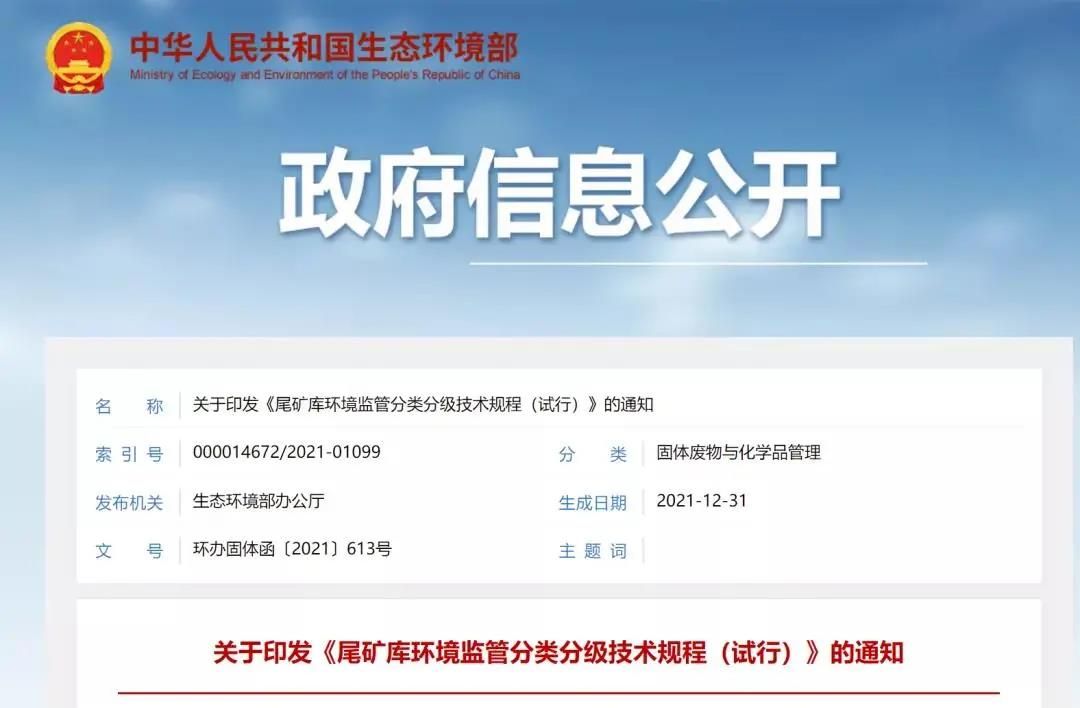 近日,生態(tài)環(huán)保部網(wǎng)站公布關(guān)于引發(fā)《尾款庫(kù)環(huán)境保護(hù)分類分級(jí)技術(shù)規(guī)程(試行)》的通知。根據(jù)通知《尾款庫(kù)環(huán)境保護(hù)分類分級(jí)技術(shù)規(guī)程(試行)》,該技術(shù)規(guī)程于2021年12月31日生成。這是尾款庫(kù)監(jiān)督管理方面極其重要的一項(xiàng)新的技術(shù)規(guī)程。