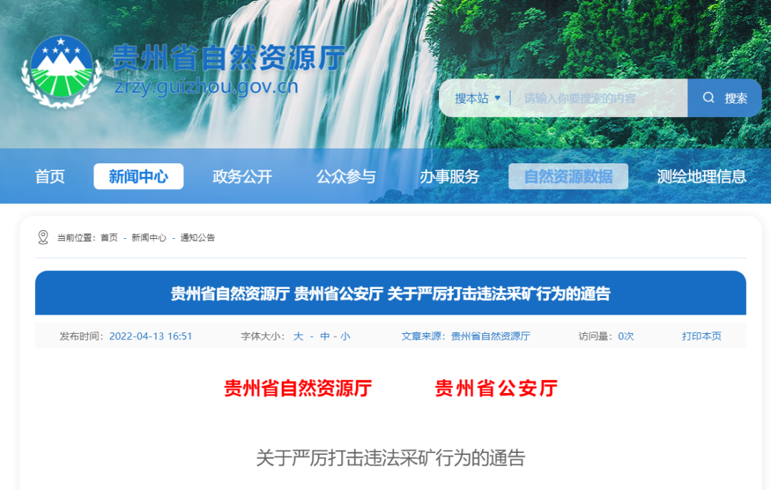 獲悉,近日,貴州省自然資源廳和省公安廳聯合發布《關于嚴厲打擊違法采礦行為的通告》(以下簡稱《通告》)。《通告》表示嚴禁任何單位或個人以任何形式非法違法盜采礦產資源。即日起,立即停止無證開采、以探代采、不按采礦許可證上載明的礦種、“洗洞”“洗坡”盜采金礦、超出批準范圍等非法違法開采礦產資源行為。