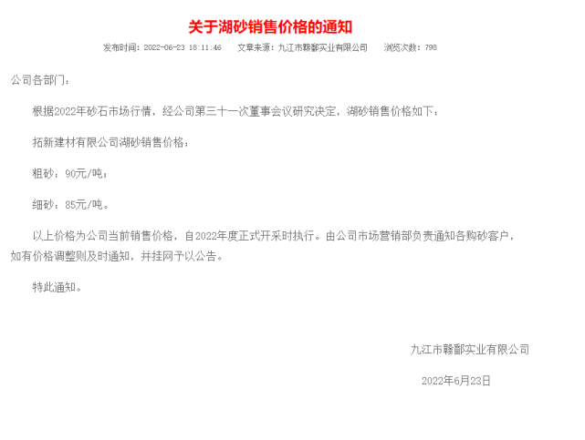 三,鄱陽湖砂:鄱陽湖砂近期銷售進展較好,自6月23日公布湖砂價格以來,采區(qū)船只密集,排號船只可達百條,下游需求恢復期間,采區(qū)價格未有變動,目前貿(mào)易商或者代理商在采區(qū)價格之上浮動約為2-4元即可上船。以下是調(diào)價通知: